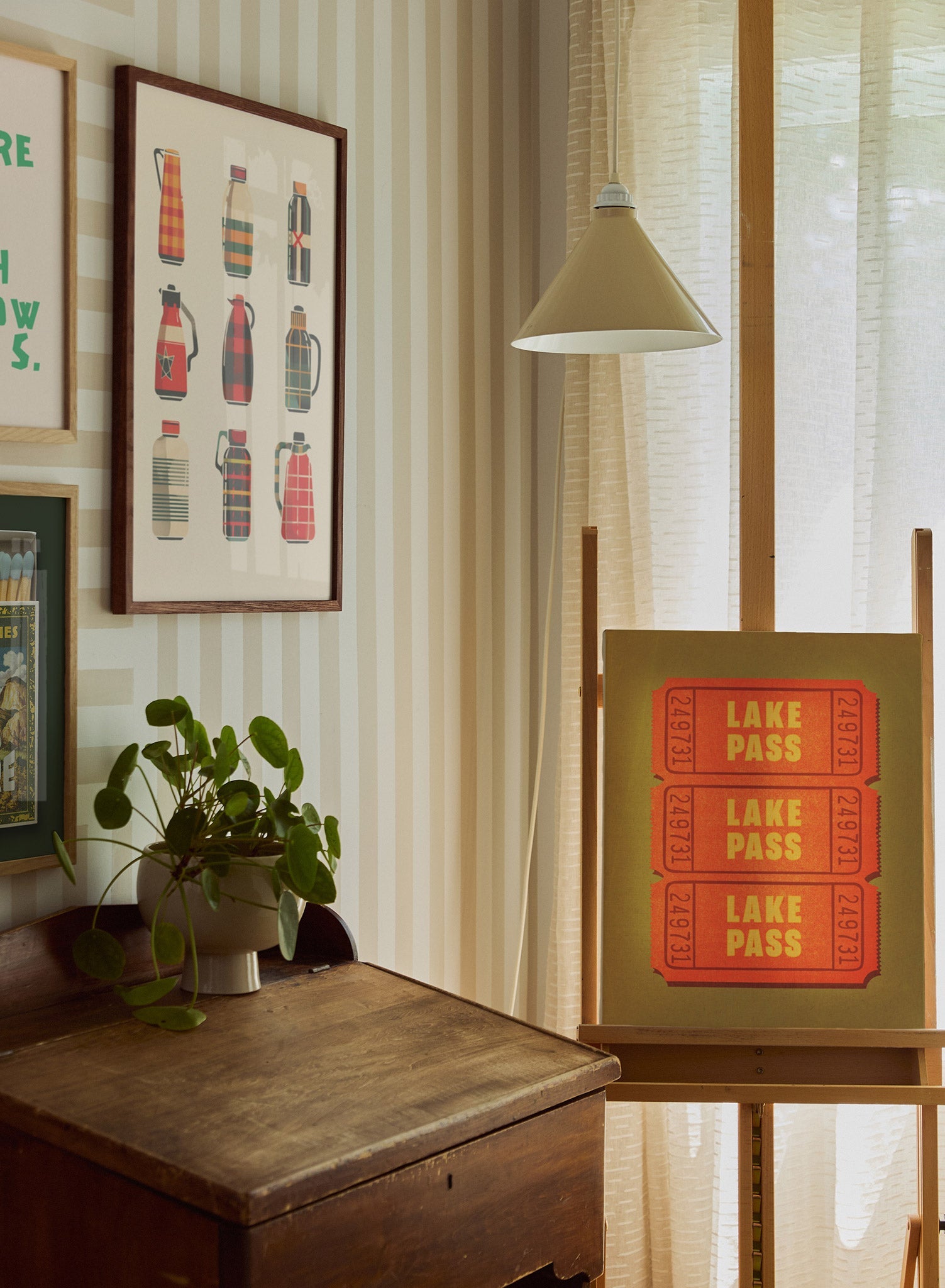 A striking vintage-style print featuring three bold red tickets labeled 'Lake Pass' against an earthy olive background. Each ticket showcases a unique serial number, adding an authentic retro feel to the piece. The vivid red and yellow typography contrasts beautifully with the muted backdrop, making this print a perfect addition to any nostalgic or travel-themed décor.