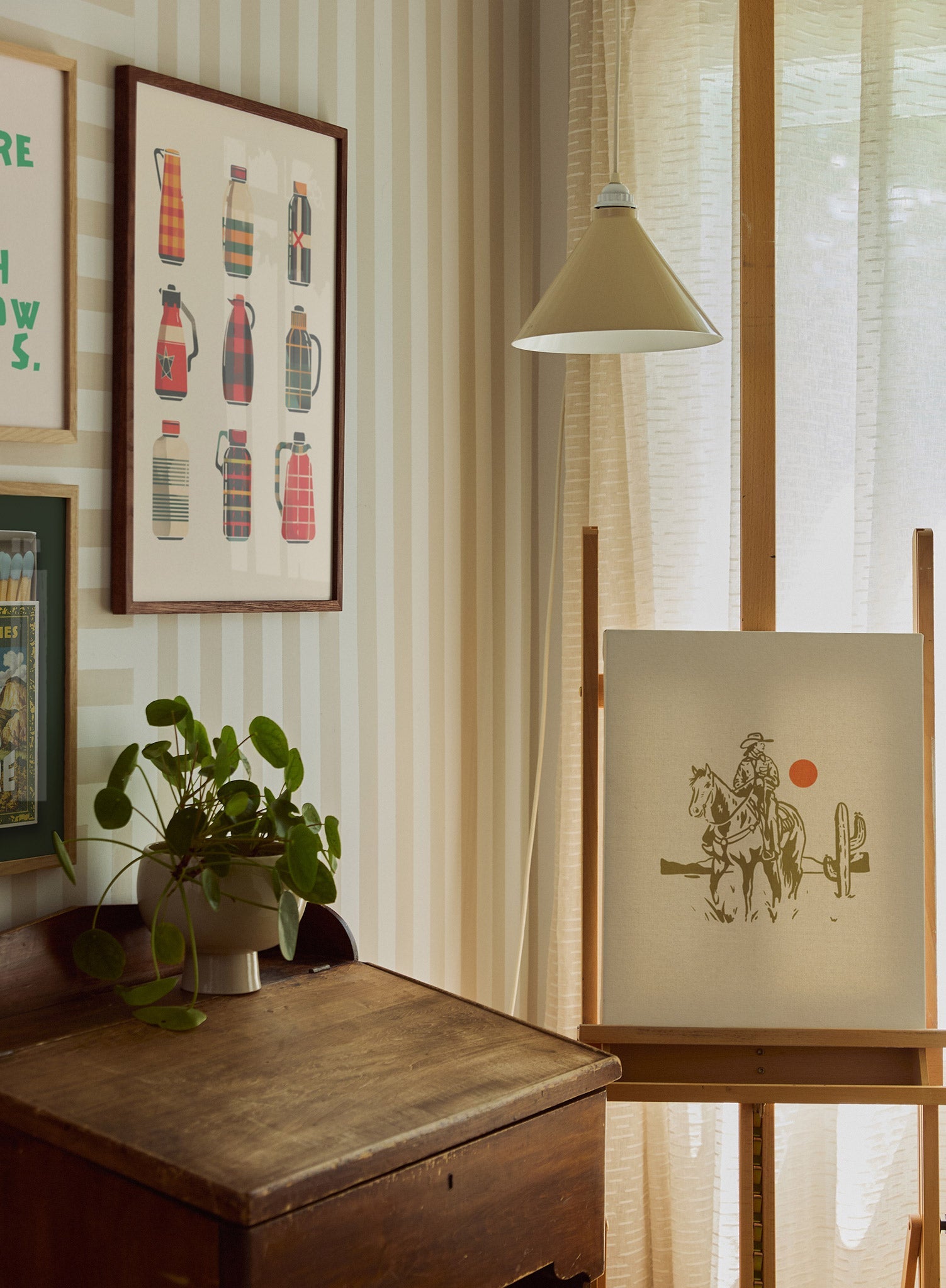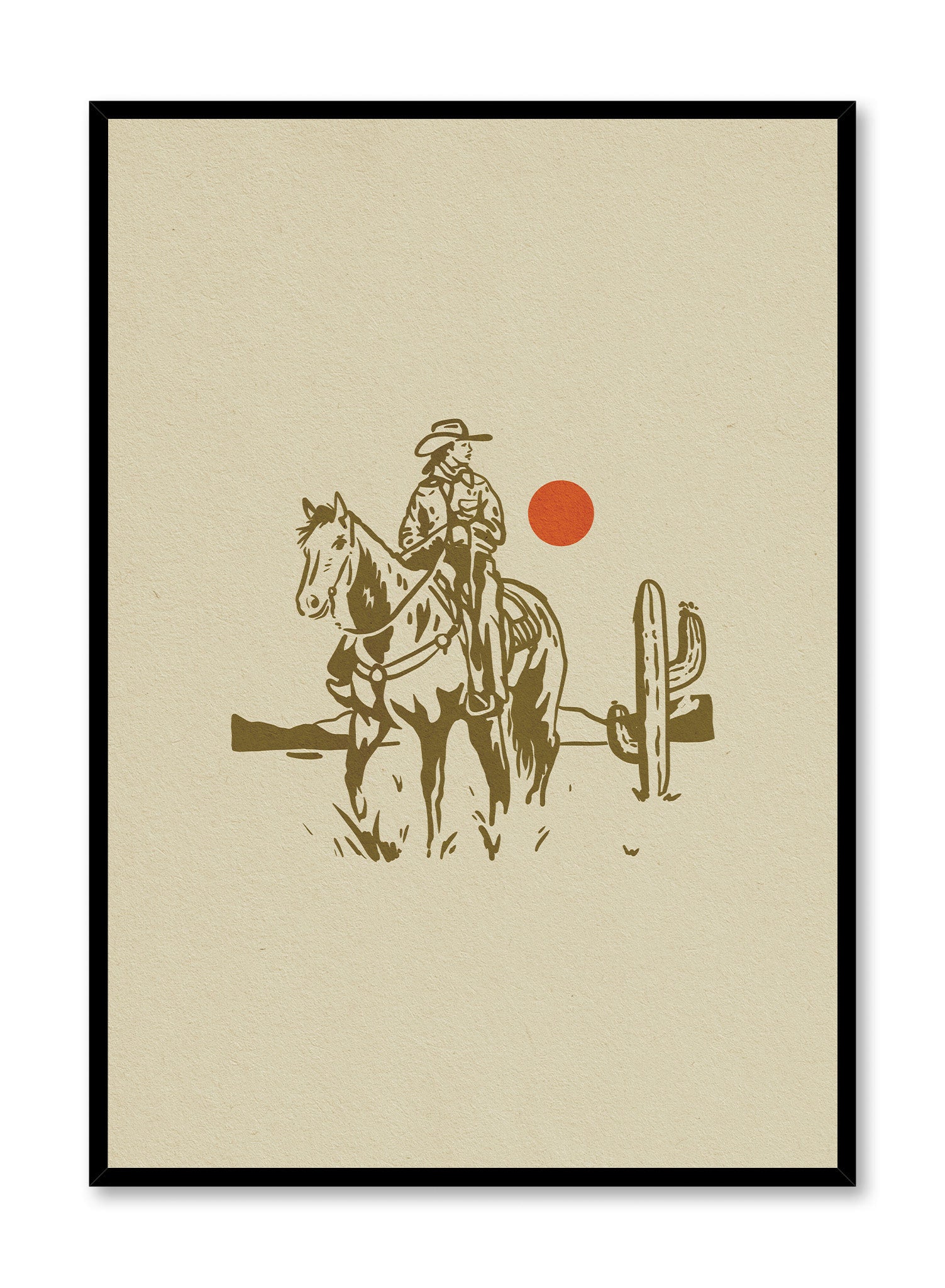 Add a touch of the Wild West to your decor with this art print featuring a cowboy and cactus. The minimalist design in earthy tones is perfect for rustic and Western-themed spaces.